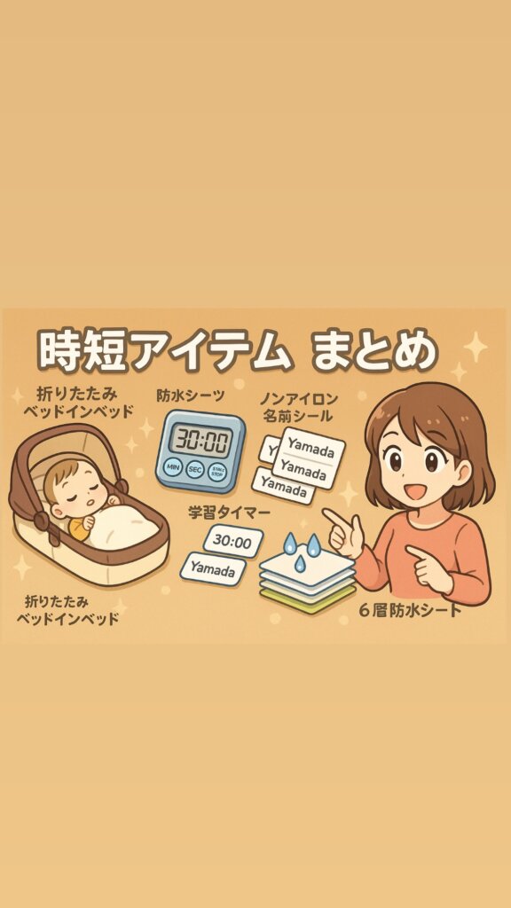 ネオママイズム「折りたたみベッドインベッド」をはじめ、防水シーツ・学習タイマー・ノンアイロン名前シール・6層防水シートを厳選紹介。出産準備や入園準備に役立つ時短アイテムまとめ。